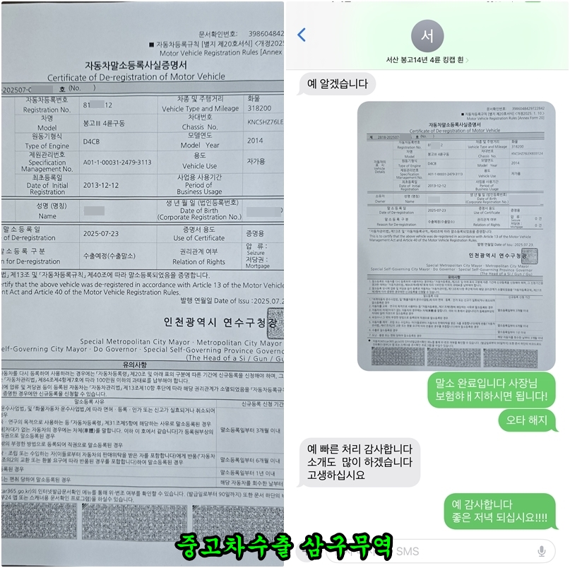 | [부산 봉고3 4륜 2007년식 중고차수출 후기] 1톤 트럭 수출 전문 삼구무역, 봉고3 4WD 직접 매입 완료 (0) | 2025.07.24 |