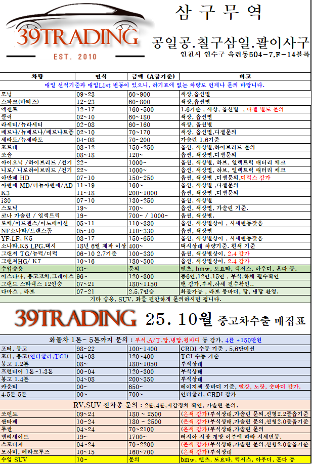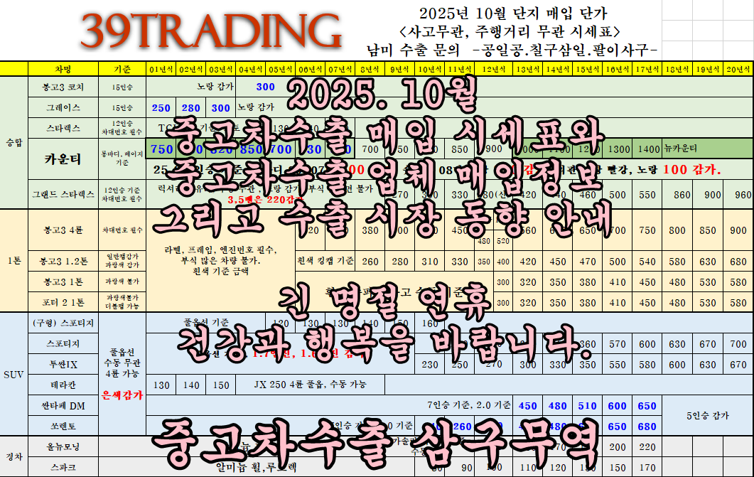 2025년 10월 중고차수출 업체 매입 시세와 수출 차종 추천